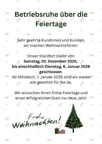 Unser Standort bleibt von Samstag, 20. Dezember 2025, bis einschließlich Dienstag, 6. Januar 2026 geschlossen.